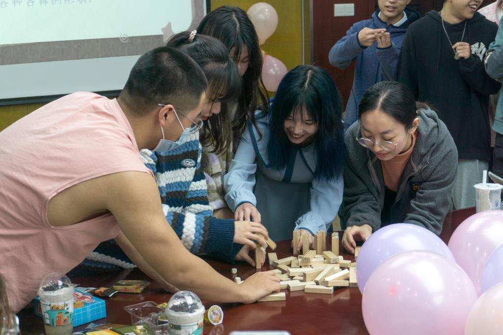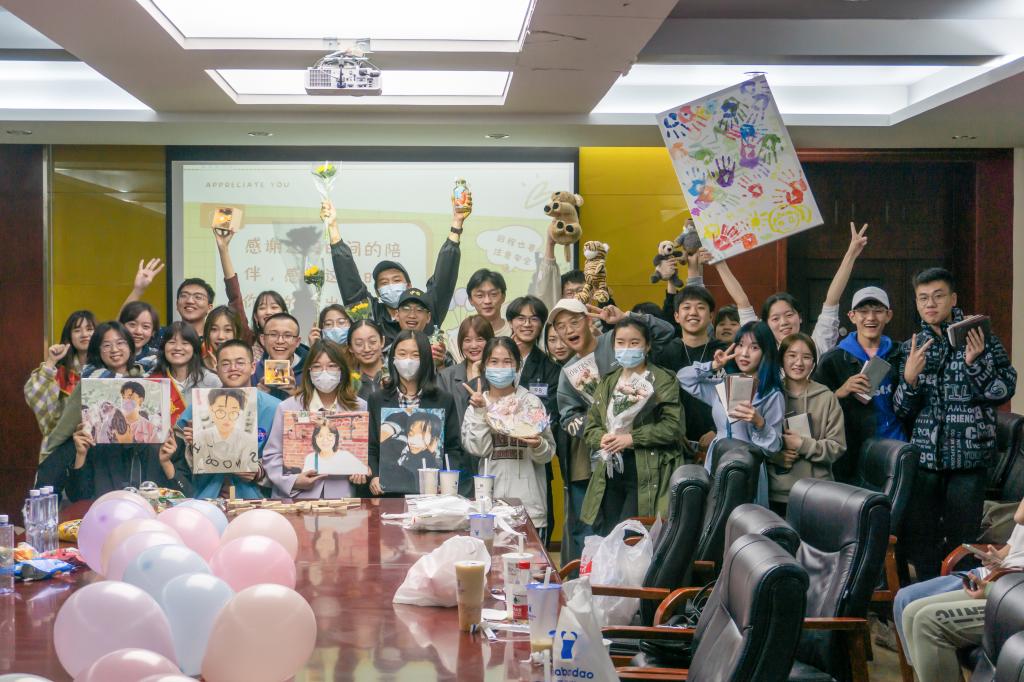 活动伊始,主持人通过组织“抓鸭子”、“拆积木”等游戏调动起全场的热情。随后,观看2021级各班员工们的感恩视频将全场的气氛推向了高潮。短短十几分钟的视频或搞怪、或煽情,承载着下班组成员与2021级员工近一年的深厚情谊。活动最后,2021级班长支书为下班组成员送上了精心准备的礼物并合影留念。