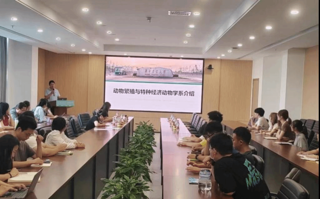 (苗义良老师向新生介绍动物繁殖与特种经济动物学系)