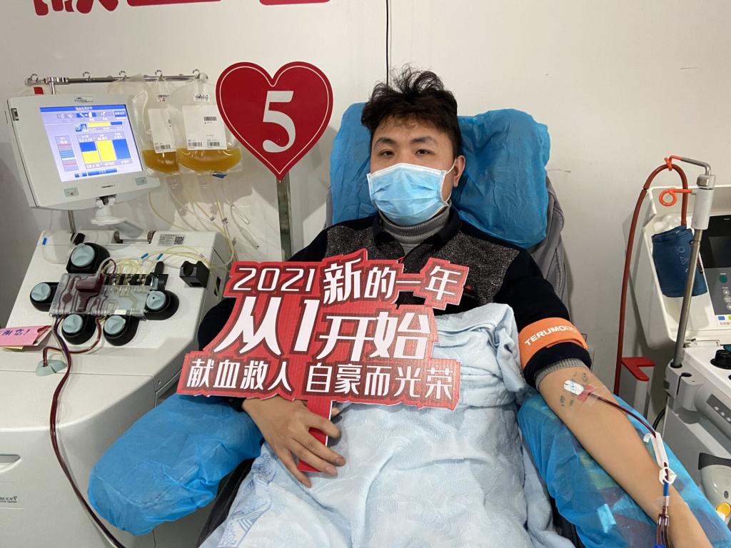 金焕松:我第一次献血是在公司,献的全血,不是很紧张,过程也比较快。其实,献血是我一直想做的事。我从18岁时起就有献血的意愿,后来在两年内献了800mL的全血、超过40个治疗量的血小板。捐献全血,两次之间最短间隔是半年;成分献血,以血小板为例,两次之间最短间隔是两周,一次最多两个治疗量。