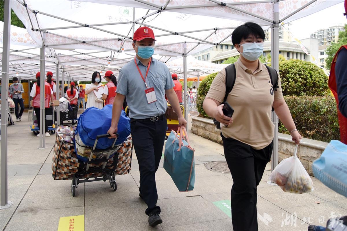 在入学通道处,设置了消毒区、查验区、核酸检测区等区域,路边停靠着一辆辆摆渡车。当新生们依次入校,穿着红马甲的志愿者们便迎上前去,帮新生们拖行李、搬上摆渡车。