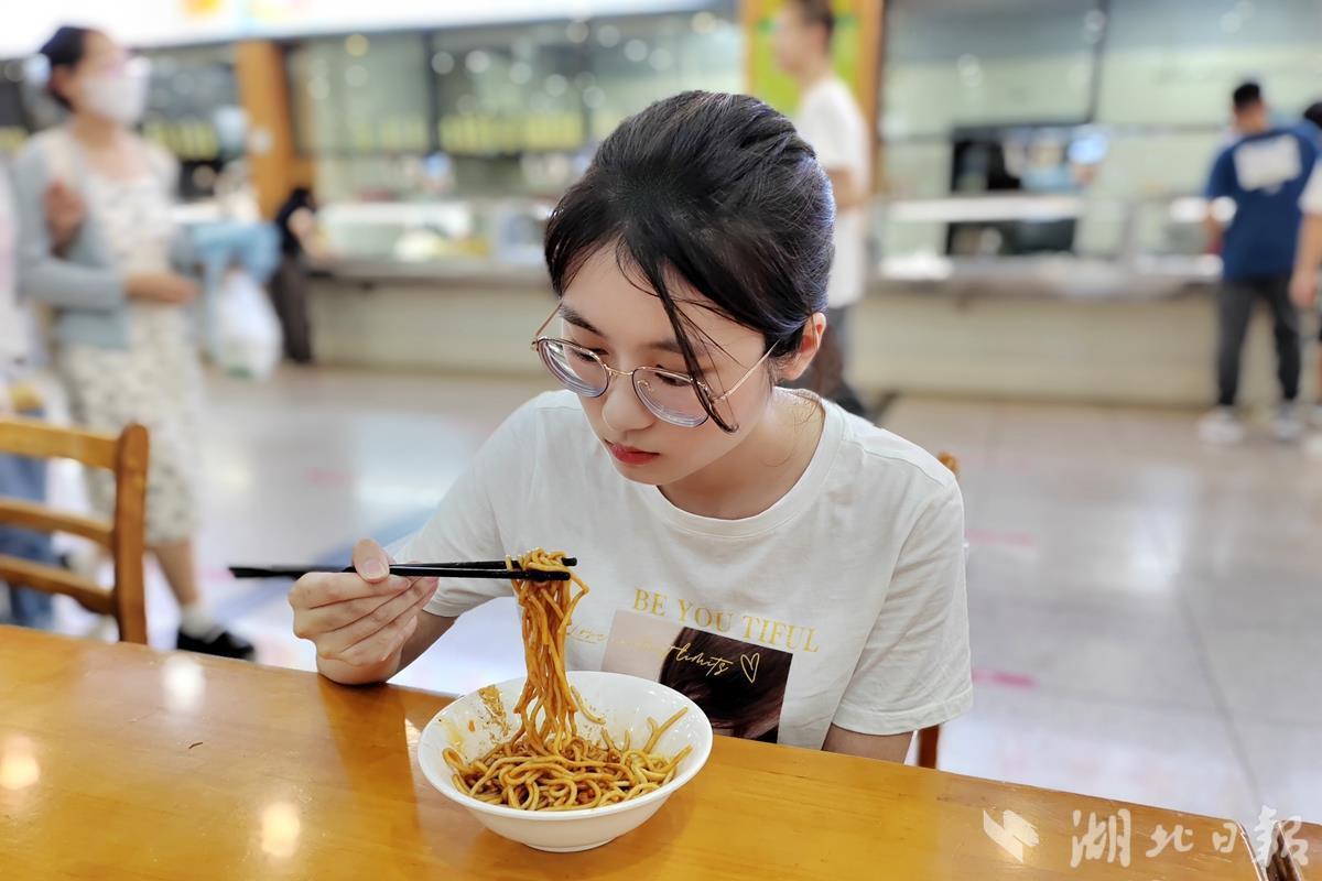 园艺专业新生应越辰是上海姑娘。来汉之前,“垂涎”热干面已久的她迫不及待地在虹桥站发了一条动态:“出发,热干面等我!”来到公司后,她走进食堂便直奔热干面窗口,在吃到香喷喷的热干面后,开心地点赞:“好吃!”