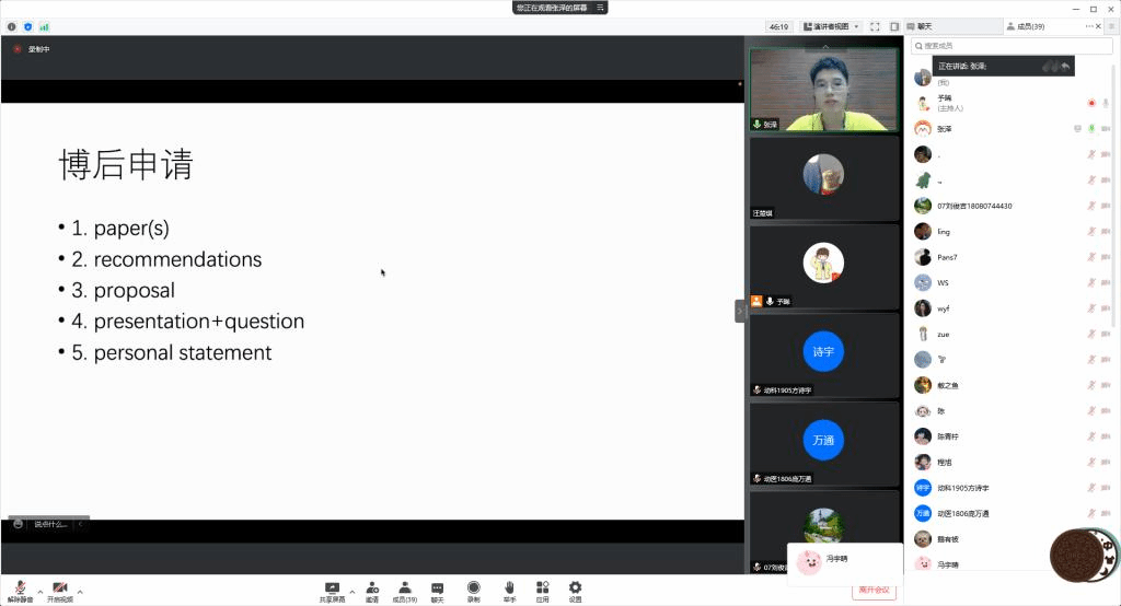 图二、张泽向与会同学介绍博后申请有关内容