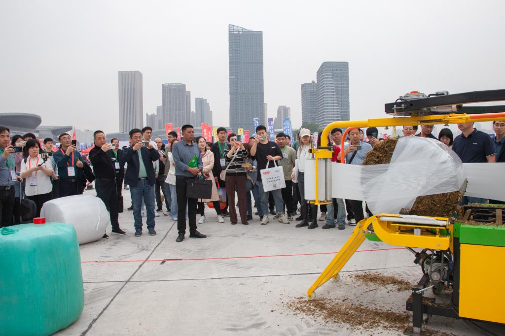 参展者于国际农机展观看包饲料机械工作过程(摄影 周信君)