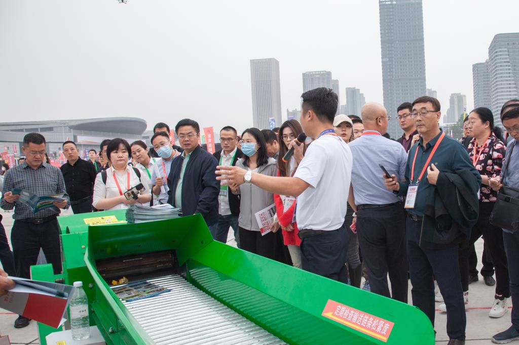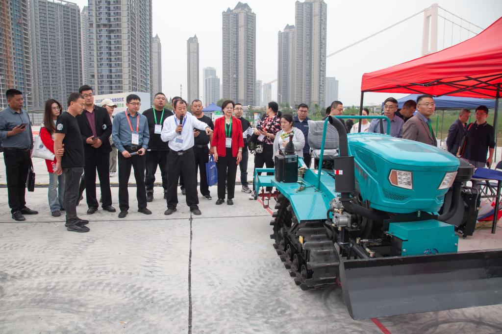 上午郭爱珍教授于中国国际农业机械展览会会场观看新型农机设备讲解(摄影 周信君)