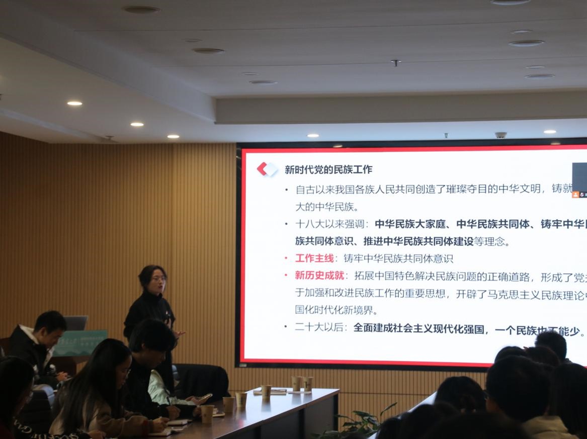徐艳介绍“三联”理论创新实践基地建设。她谈到,要充分发挥洪山区“大学之城”高校云集的区位优势,进一步创新华农西社区高校区域化党建联建,推动校舍公寓工作高质量发展,努力创新党的理论宣传工作的方式,加强理论与实践的对接,共建社区与高校院系“联学、联言、联动”的理论创新实践基地。她还展示了社区开展“三联”活动以来取得的诸多成就,并希望在今后能够进一步加强社区与各公司党支部间的合作,共同进步。
