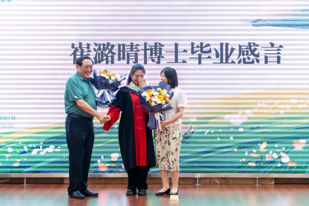 崔潞晴博士接受导师送花(学通社记者 韩鑫垚 摄)