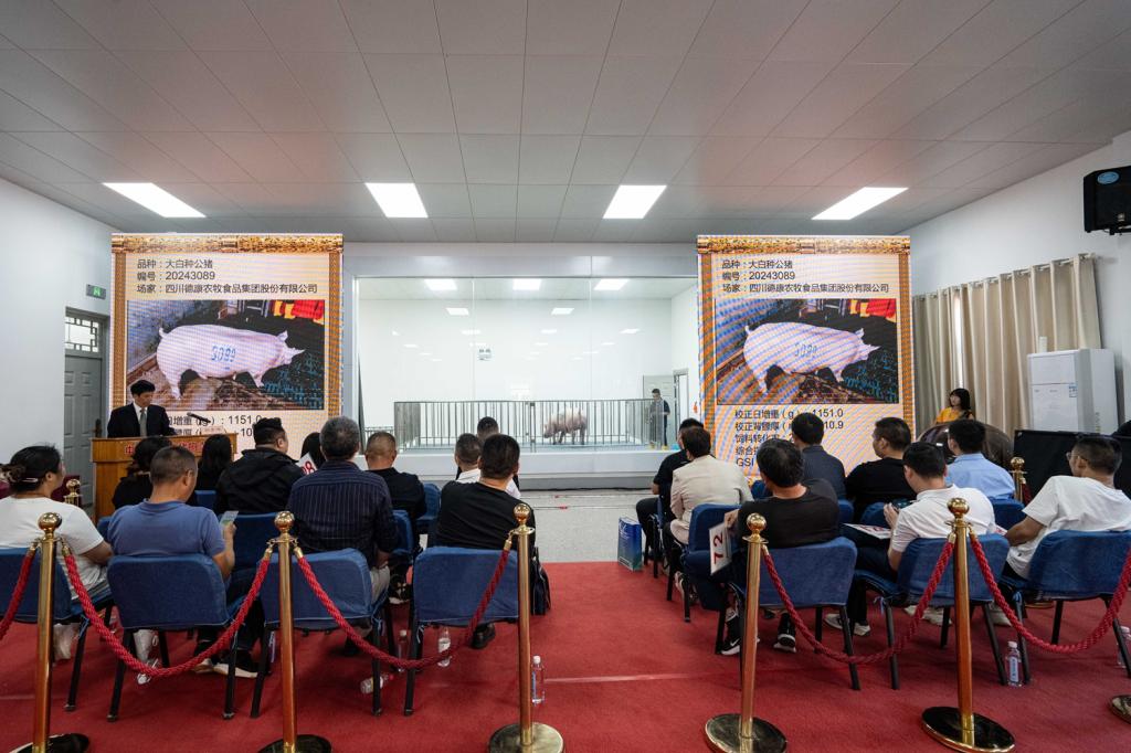 拍卖现场布置得井井有条,各个区域划分明确。拍卖厅前方,两排座椅整齐排列,来自不同省市的企业代表们围坐两侧,目光紧盯着大屏幕和正中间紧拉着的帘子,期待着自己心仪的种猪登场。