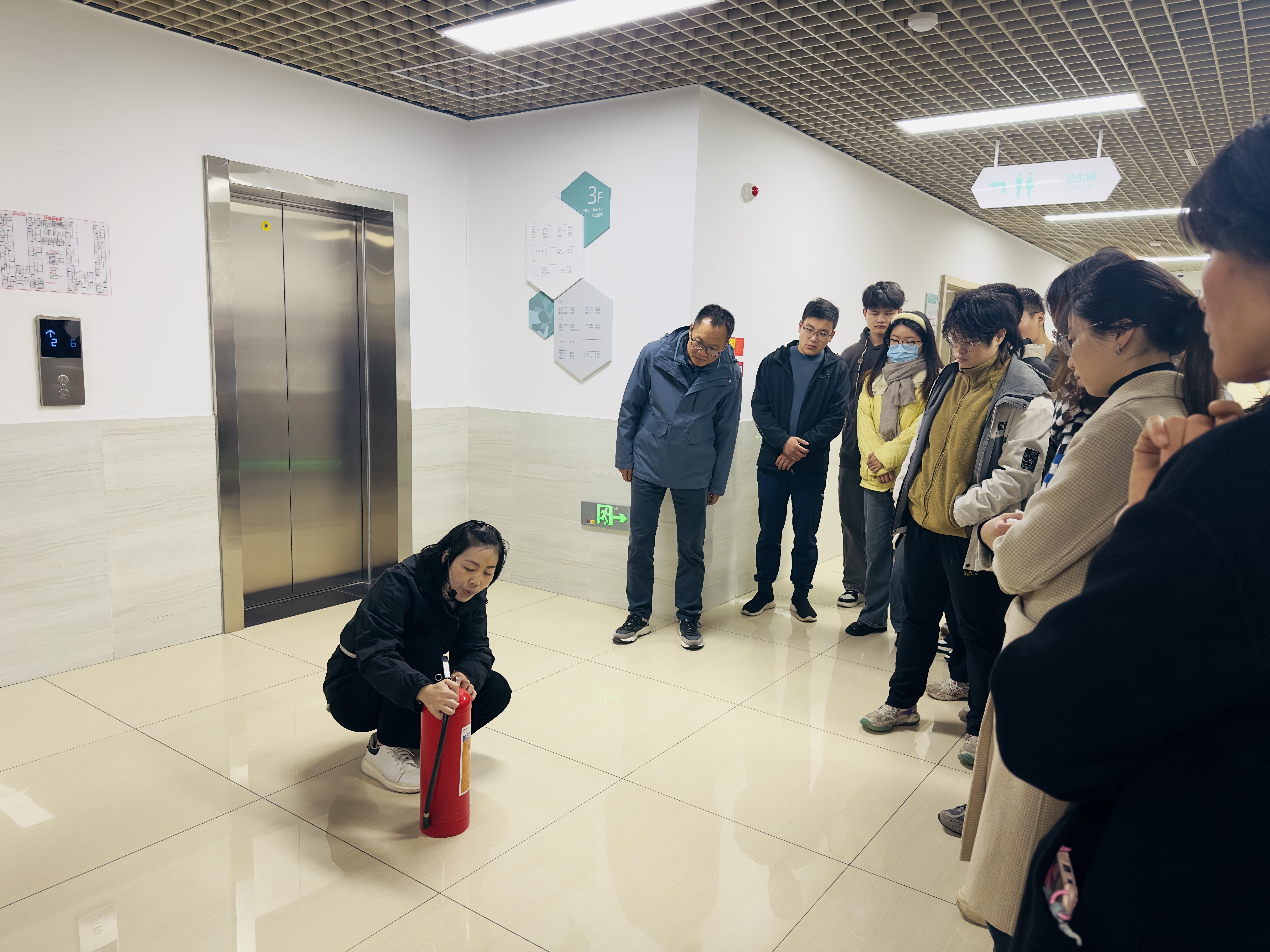 随后,武汉点方职业培训公司张玉勤带领在场师生同走消防通道,对沿途各类消防设施功能和使用方法、注意事项等进行了讲解,如紧急手动报警器如何使用,声光报警信号如何区分,应急安全出口标识如何辨认等。紧接着全员现场模拟演练了消防疏散逃生的正确方法。最后张玉勤对如何正确拨打报警电话,如何正确应对高楼层火灾,如何开展自救措施等作了详细介绍,提醒大家在学习工作中须提高警惕、注意预防,始终把生命安全放在首位。