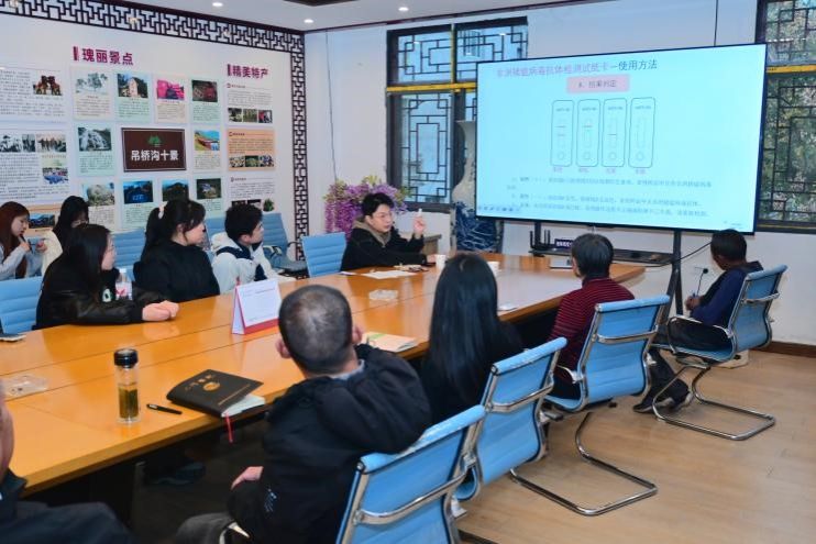 付岳林在非洲猪瘟的防控与检测技术上为当地养殖户提供了专业的指导和建议。非洲猪瘟是急性、烈性、高传染性和高死亡率的动物传染病,是生猪养殖业所面临的重大传染疫病之一。自2018年以来,非洲猪瘟在我国的发生频率、蔓延范围不断扩大,造成了巨大的经济损失。付岳林在培训中强调,在非洲猪瘟常态化下的猪瘟疫病防控需要完善生猪养殖的基础设施,重视猪舍环境管理和日常消毒管理,制定科学的饲养方法,同时要做好非洲猪瘟疫情的监测。随后,付岳林为养殖户们详细介绍了快速检测试纸条的工作原理以及使用方法。