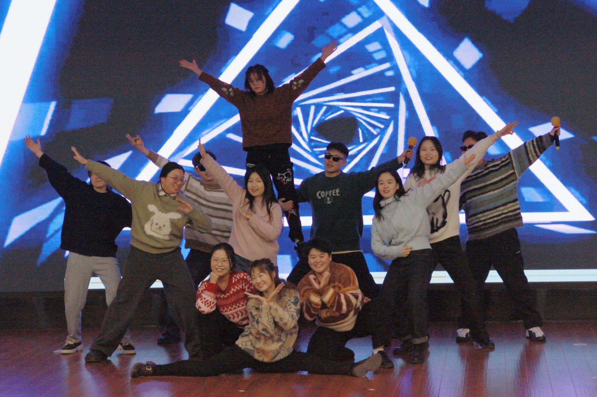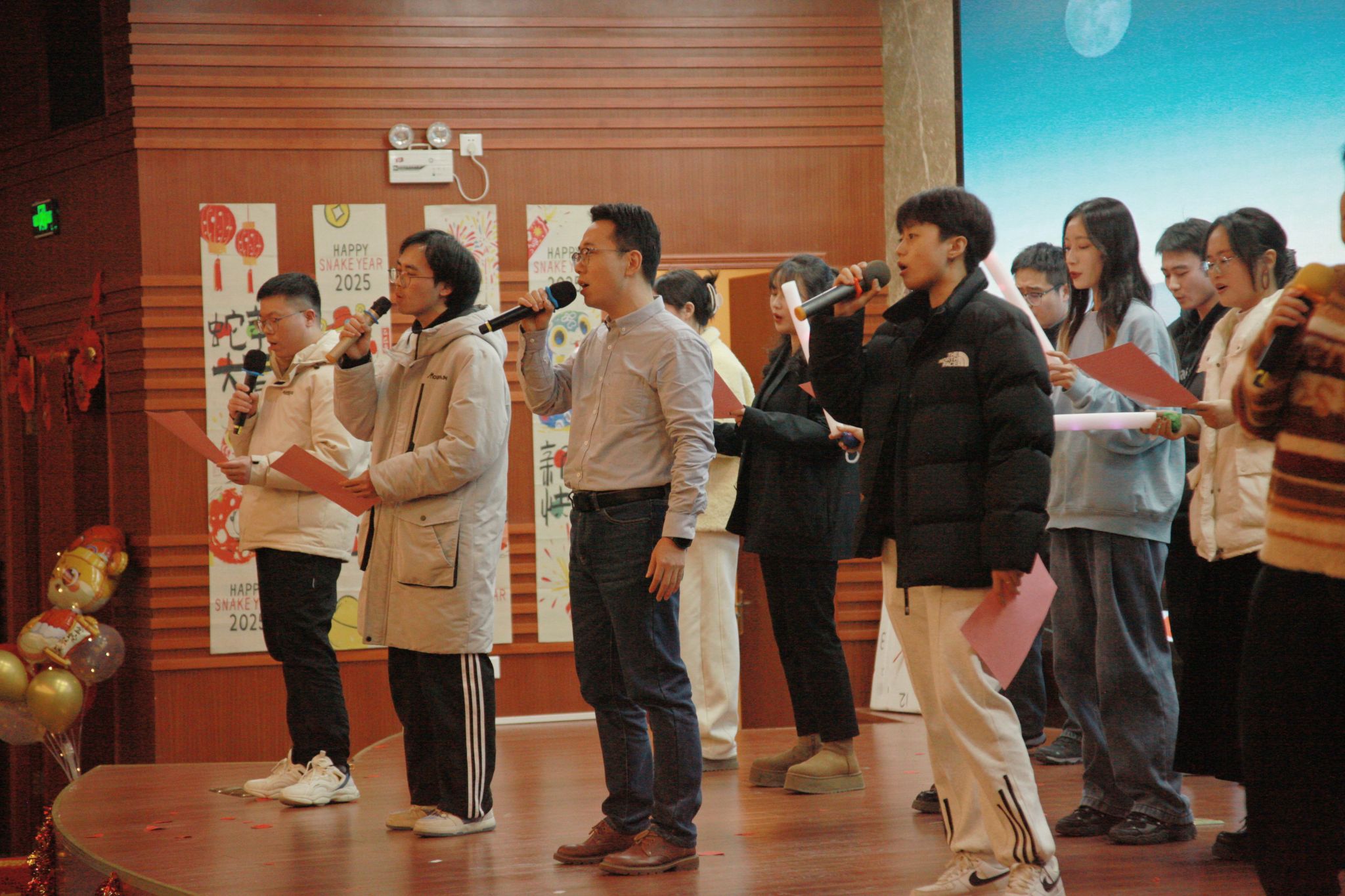 晚上7点,联欢会在2024年实验室的回忆视频中拉开帷幕。主持人闪亮登场,隆重宣布晚会正式开始。陈颖钰老师和员工带来舞蹈《你要跳舞吗》,以其欢快至极的节奏和充满激情的舞蹈,如同一把炽热的火焰,瞬间点燃现场的气氛。紧接着,短剧《研究生的名义》用幽默诙谐的方式围绕“学术诚信”这一主题,生动展示了“学术有道,诚信为本”的重要性。博一和博二研究生联合带来的配音秀更是引得观众爆笑不止,演员们用《激战江南》和《甄嬛传》的经典片段作脚本,混合运用普通话和各地方言,惟妙惟肖地演绎了员工们在组会进展汇报中未准备PPT,情急之下拷贝一个3kb文件的尴尬。舞蹈串烧《CONO+大哥大》充满活力,再次点燃了现场热情。王铎和职工陶飞(Taufik)深情合唱《月亮代表我的心》惊艳全场。歌舞《恭喜发财》将晚会的新年喜庆氛围推向高潮。2024届新生演绎的小品《时间都去哪了》,生动诙谐且妙趣横生地讲述了员工们难以抗拒手机诱惑,让时间在不经意间悄然流逝而陷入无法完成导师布置任务的纠结与挣扎之中的情景。张磊老师和博士团队带来的大合唱《不要慌,太阳下山有月光》以饱含情感的治愈嗓音将这首鼓励人们在困境中保持希望、相信未来美好的歌曲演绎得淋漓尽致,深深触动了在场每一个人的心弦。
