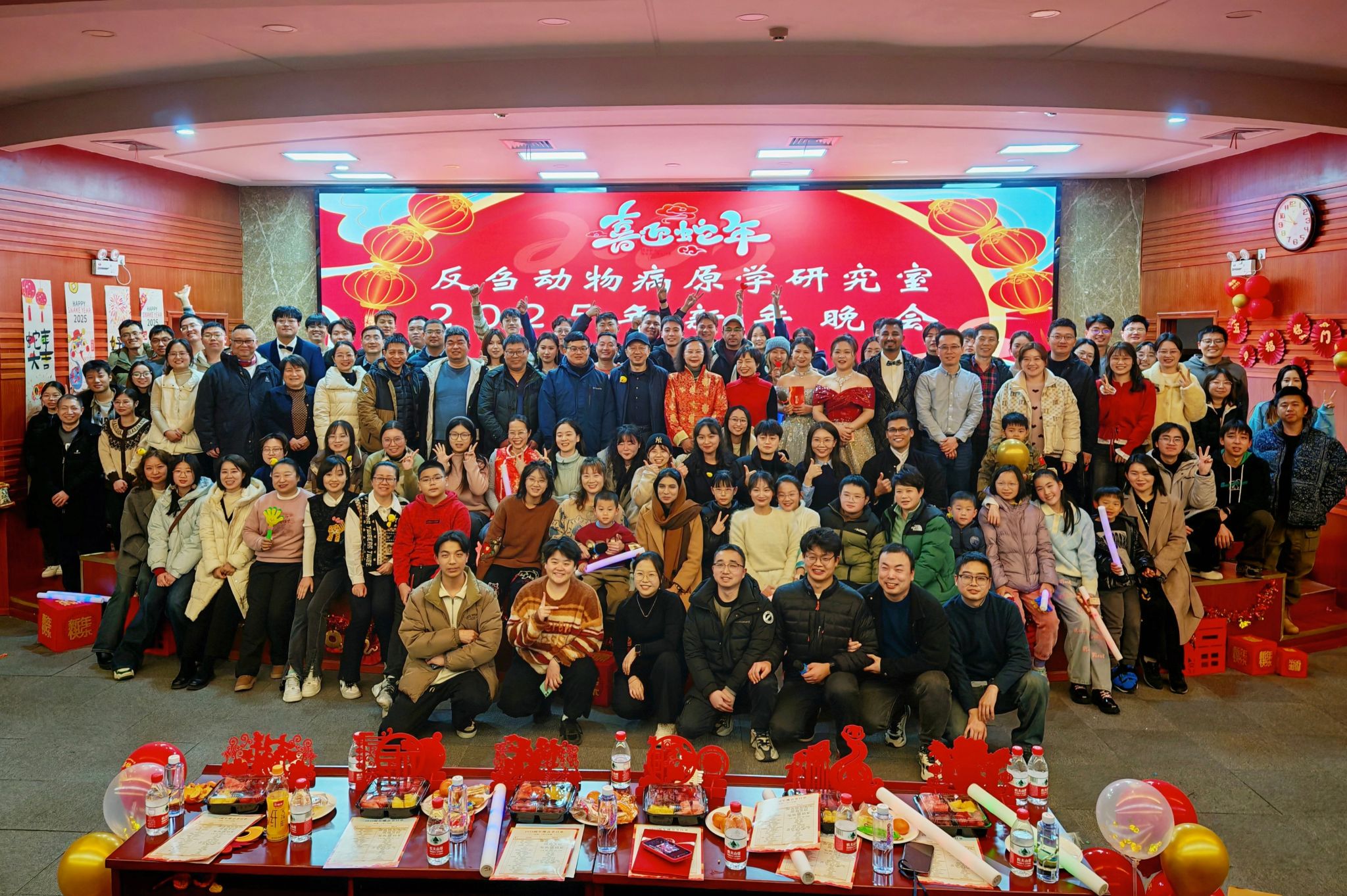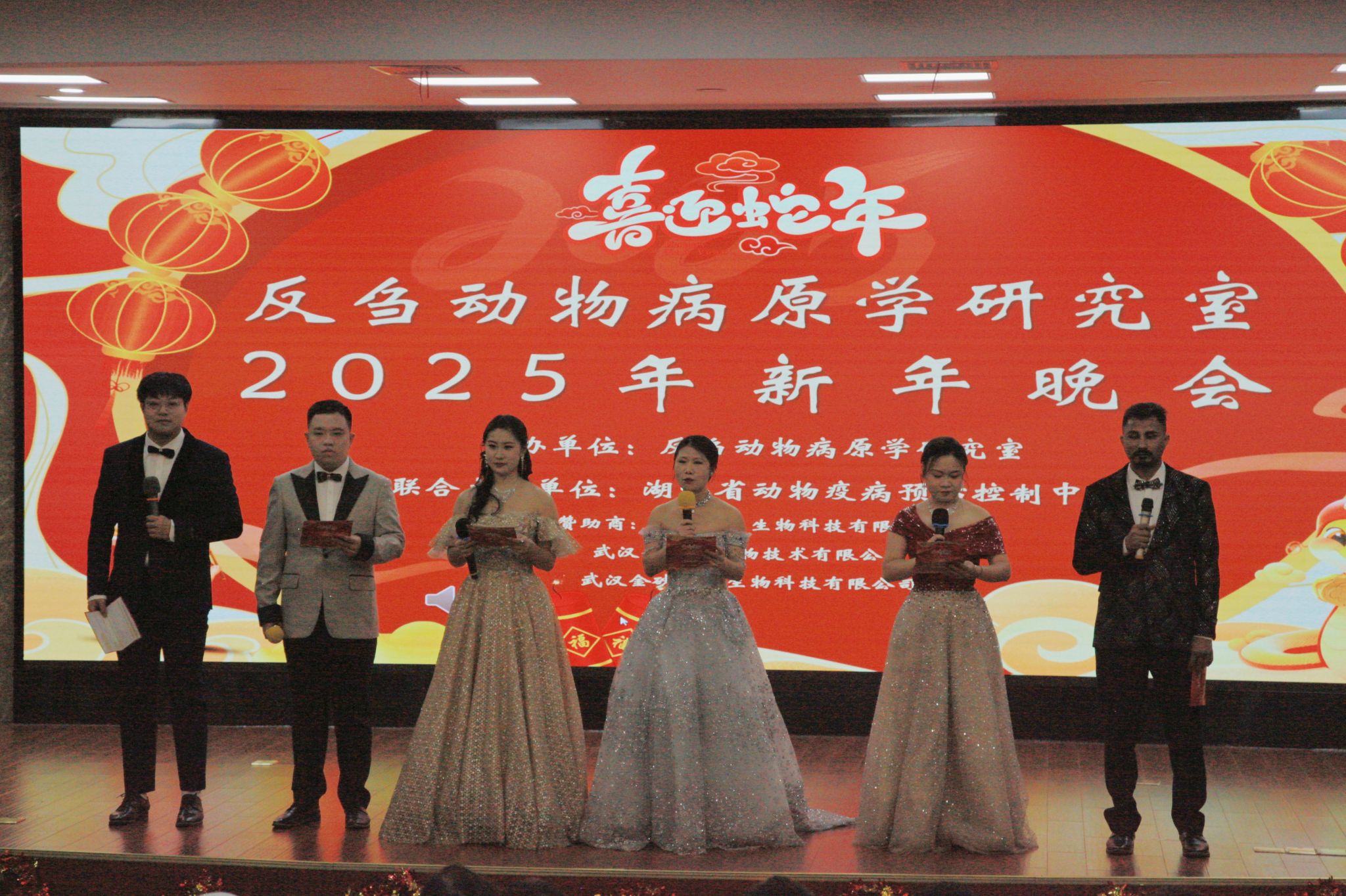 (通讯员:方成威、姜彦竹,拍摄:朱梓菲)2025年1月17日星期五晚,bevictor伟德反刍动物病原学研究室与湖北省动物疫病预防控制中心在生猪健康养殖协同中心一楼报告厅联合举办2025年新年晚会。反刍动物病原学研究室负责人郭爱珍教授和湖北省动物疫病预防控制中心谢军主任、两单位全体师生员工、多位兄弟实验室的老师等共计100余名欢聚一堂,辞旧迎新,自编自演的节目既贴近生活又富有创意,现场欢声笑语不断。此外,节目还穿插着颁奖环节,对过去一年做出突出贡献的同学们进行了奖励,最后,大家合影留念,圆满辞别龙年,共祝蛇年再创佳绩!