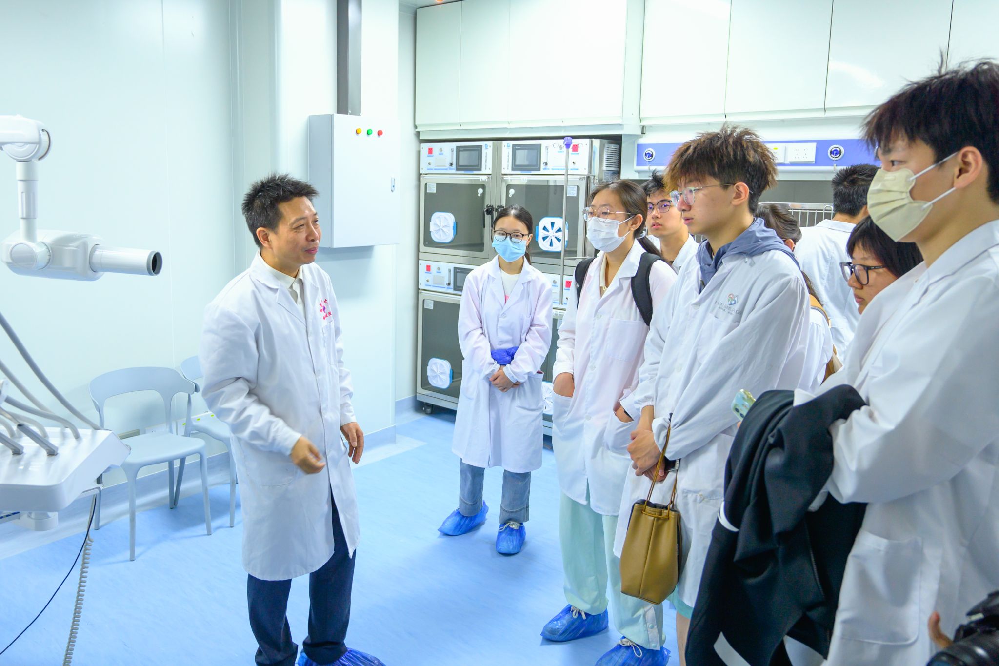世界兽医日当天,bevictor伟德教学动物医院里人头攒动,“探秘兽医的一天”活动在此开展。活动中,胡长敏教授化身“领路人”,带领同学们参观医院多个区域。从预防门诊的专业检查装置,到异宠门诊的特殊诊疗注意事项;从超声和CT室的先进设备,到康复中心中医针灸在宠物康复中的妙用,再到猫科、犬科注射室和化验室,每一处都讲解得细致入微。走进手术区,胡长敏特别指出:“手术室必须严格遵守无菌要求。为了避免污染,手术室的门都用脚进行开关。”