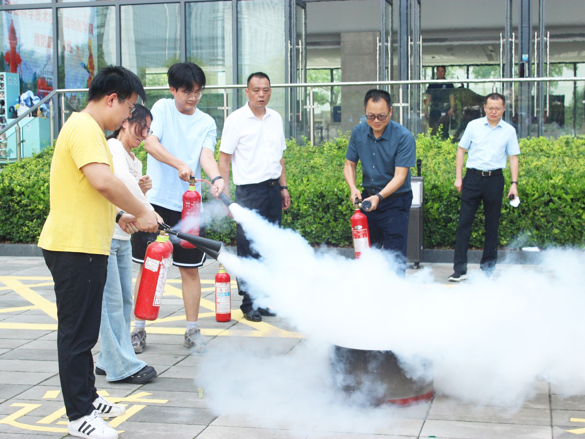 刘兴斌书记与师生一同实操灭火(记者 任清竹 梁舒雯 摄)