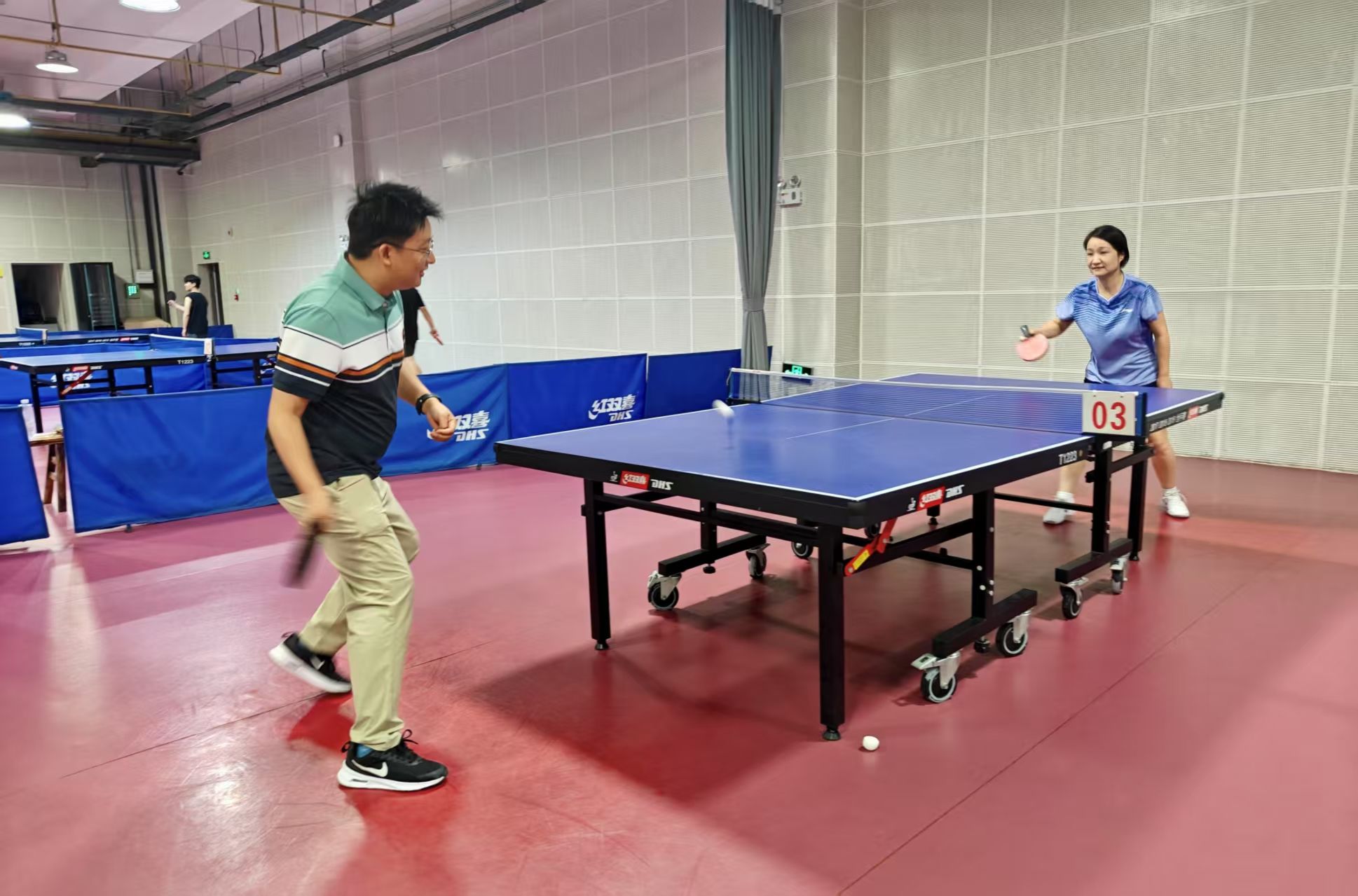 规则确定后,所有选手进行热身运动,以确保能够在比赛中发挥出最佳状态。比赛正式拉开帷幕,现场充满了欢声笑语和紧张的竞技氛围。本次乒乓球赛共进行了九局1v1对决,每场比赛都精彩纷呈,扣人心弦。选手们在场上全力以赴,挥洒汗水。观众席上不时传来阵阵喝彩,气氛十分热烈。