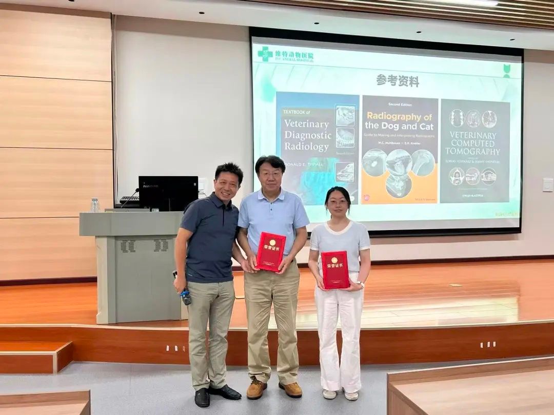 下午的兽医影像公开课上,谢富强老师就小动物临床常用影像检查技术之比较(比较影像学)作专题报告,课程深入浅出地讲述了几大主流检测方式的原理和适用场景。袁雪梅老师以“影像检查在临床诊疗中的应用场景”为题作了专题报告。她通过一系列典型临床病例,生动而详尽地展示了如何运用多种影像学手段进行病情分析与诊断,内容深入浅出,极具实践指导意义。课程结束后,在胡长敏老师的主持下,大会为授课嘉宾谢富强老师、袁雪梅老师以及本次会议的赞助商礼蓝动保颁发了奖项。