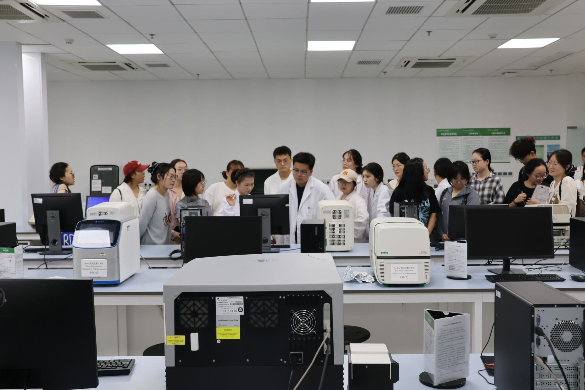 下午,公共仪器中心组织开展“通用设备培训与实操体验”活动,将理论知识转化为实践能力,让师生在“零距离”接触高端仪器的过程中,深化对设备功能的认知,明确与自身科研需求的对接点。在中心技术人员赵迪、梁卫卫等老师的带领下,师生代表分为三组,依次前往七大子平台。每到一个平台,技术人员都结合实际仪器,开展“一对一、手把手”的讲解与指导:在成像平台,梁卫卫老师现场操作激光共聚焦显微镜,演示“样本放置-参数调节-图像采集”的全过程,让师生亲自上手尝试“调整焦距”“选择激发波长”“保存图像数据”,并针对“如何减少背景荧光干扰”“如何优化图像清晰度”等问题进行实时解答;在分子生物学平台,赵迪老师演示了实时荧光定量PCR仪的“反应体系配置-样品加载-程序设置-结果分析”流程,指导师生观察“荧光信号曲线”,解读“Ct值与基因表达量的关系”。现场学习氛围浓厚,师生们热情高涨,纷纷围绕自身科研项目提出问题。一位从事“动物疫病防控”研究的研究生表示:“之前只知道中心有高端仪器,但不知道具体能解决什么问题,今天通过现场体验,不仅学会了基础操作,还明确了如何用STED显微镜观察病毒与细胞的相互作用,为我的课题研究提供了关键支撑。”此次现场实操体验活动,不仅让师生“看得见、摸得着、学得会”,更实现了“仪器资源与科研需求”的精准对接,有效解决了“仪器与需求脱节”的问题,为后续师生高效利用中心资源、加速科研进展奠定了坚实的实践基础。