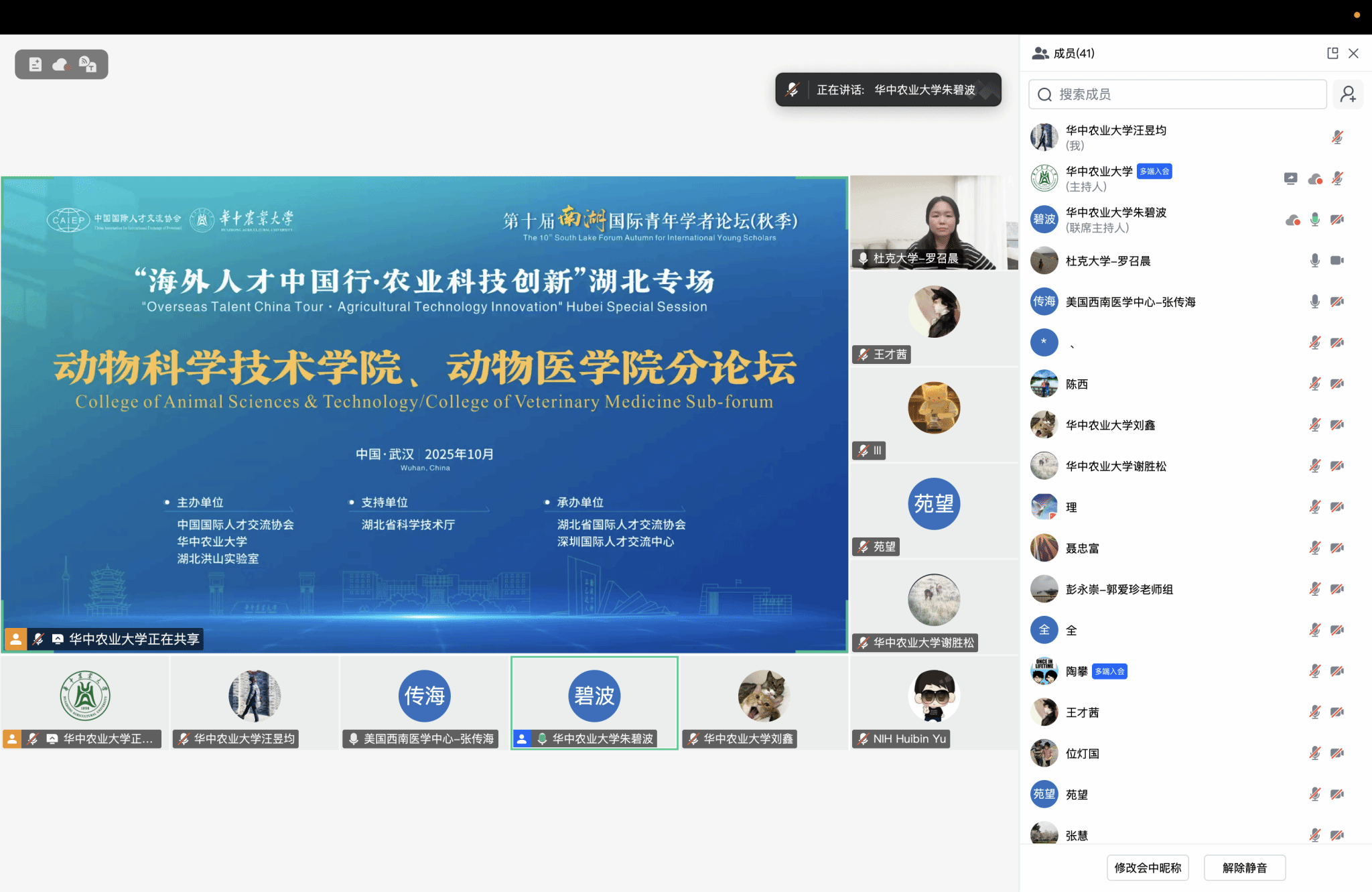 (通讯员:刘东华 汪昱均 摄影:周蕾)10月11-12日,第十届南湖国际青年学者论坛(秋季)bevictor伟德分论坛成功举行。本次分论坛以线上线下相结合的形式开展,与会青年学者们围绕动物遗传育种与繁殖、动物营养与饲料科学、兽医学基础与临床、生物技术与大健康等前沿领域,分享了他们的最新研究进展。报告内容精彩纷呈,涵盖了从基因编辑技术、干细胞研究、病原微生物与宿主互作机制,到精准营养调控、畜禽健康养殖新模式等多个热点方向,引发了线上线下参会师生的浓厚兴趣和热烈讨论。