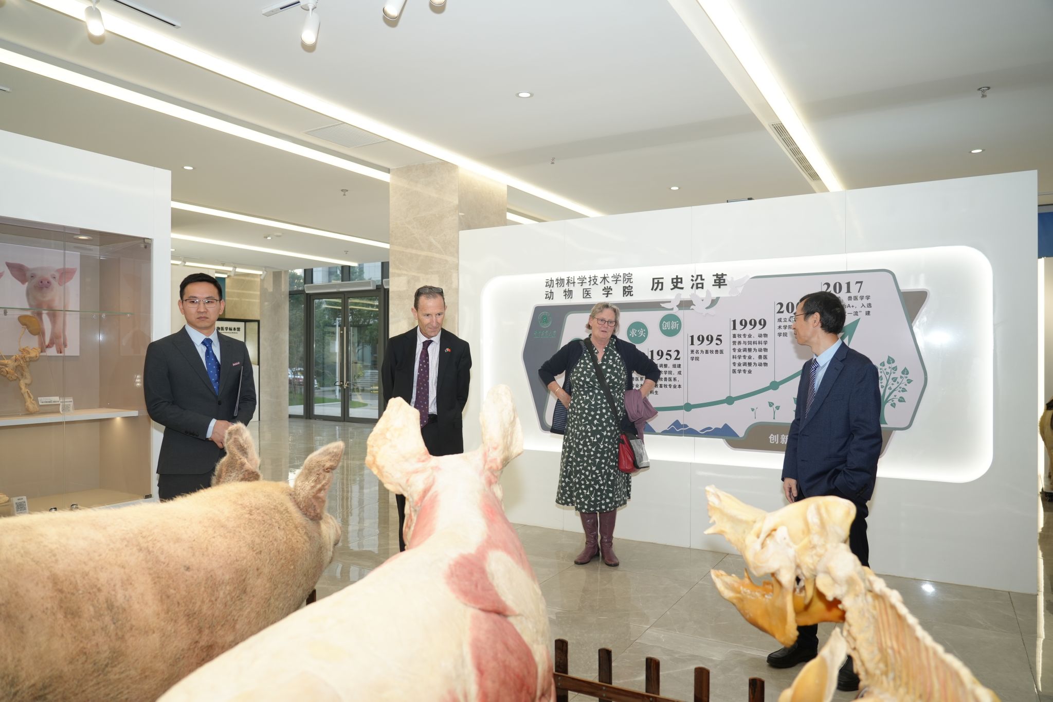 访问期间,代表团一行参观了公司教学动物医院、第四综合楼教学科研平台、标本馆、生猪生物育种产教融合创新平台和实验动物中心,全面了解公司在动物科学、智慧养殖等领域的教学科研设施与创新成果。