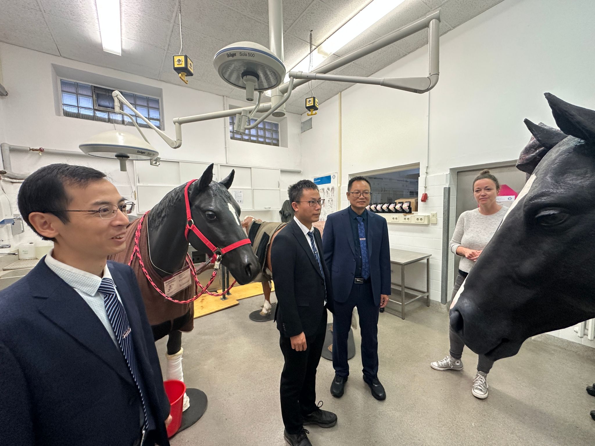 在柏林自由大学兽医公司,代表团与经理Uwe Rösler及公司相关人员进行座谈。Rösler经理分享了该院与泰国、印度尼西亚等国合作培养职业兽医的成功经验。刘兴斌表示,两院在科技创新与社会服务领域的理念和定位高度契合,期望双方找准合作切入点,共同践行“同一个健康”理念。他提出,希望借鉴对方经验,在构建高水平兽医人才培养体系方面深化合作,并围绕疫病防控等优势科研领域强强联合,推动科研水平迈向新高度,同时欢迎对方师生来校交流。代表团还详细参观了公司的多个研究所、马兽医教室和图书馆等教学科研设施。
