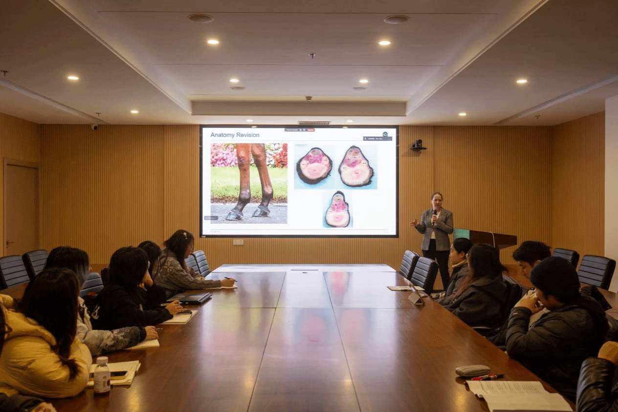 访问期间,彭洁诗博士还为公司师生带来了题为“马肌腱与韧带损伤诊疗”的专题讲座,系统讲解了相关病理机制、常见疾病和诊疗方案。讲座现场互动踊跃,气氛热烈,获得了师生们的积极反响。
