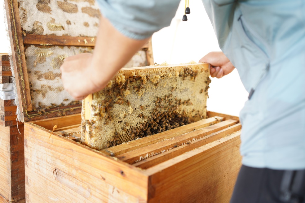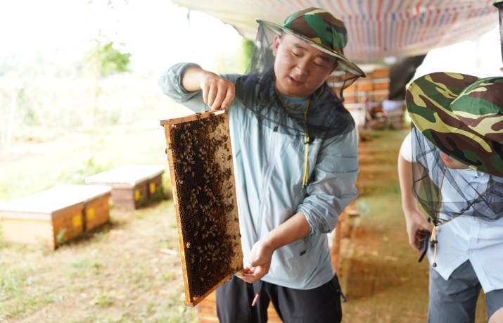 有毕业生表示对公司的蜂场有所了解,但从没近距离地观察过蜂箱、蜂脾。开拓眼界之际,他们也为公司蜂场建设得如此成熟完备感到自豪。人群中有几位小朋友正看得起劲,家长纷纷表示:“小朋友喜欢吃甜食,尤其爱蜂蜜。希望他们可以了解一滴蜜是怎么来的,蜜蜂又是如何分工的。”从小朋友成长为即将毕业的“大朋友”,从小小的幼虫到酿出香气四溢的蜂蜜。这一刻,人和自然在蜂场中以“时间”的名义相通。