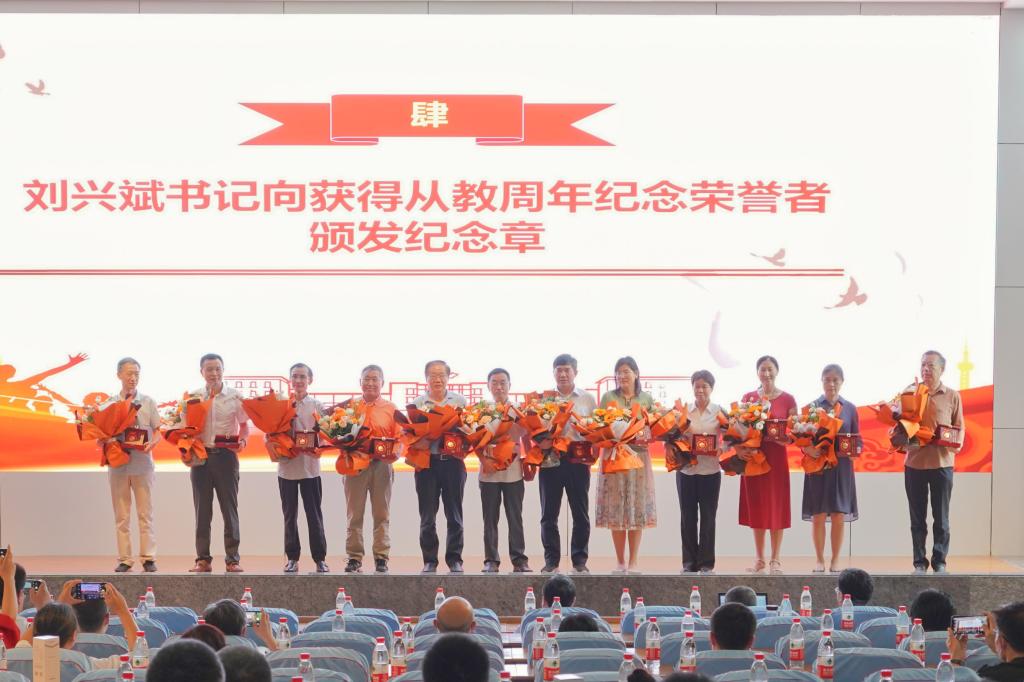(刘兴斌书记向从教30周年纪念荣誉者颁发纪念章)