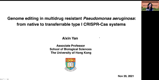 闫爱新副教授报告题目为“多重耐药铜绿假单胞菌的基因编辑”,介绍了利用内源性CRISPR-Cas系统实现多重耐药菌株一步法基因编辑,继而重点阐述了通过导入外源性type-I-F CRISPR-Cas系统实现不携带内源性CRISPR-Cas系统的铜绿假单胞菌及其他菌株的基因编辑,为功能基因组学研究提供了有力的工具。