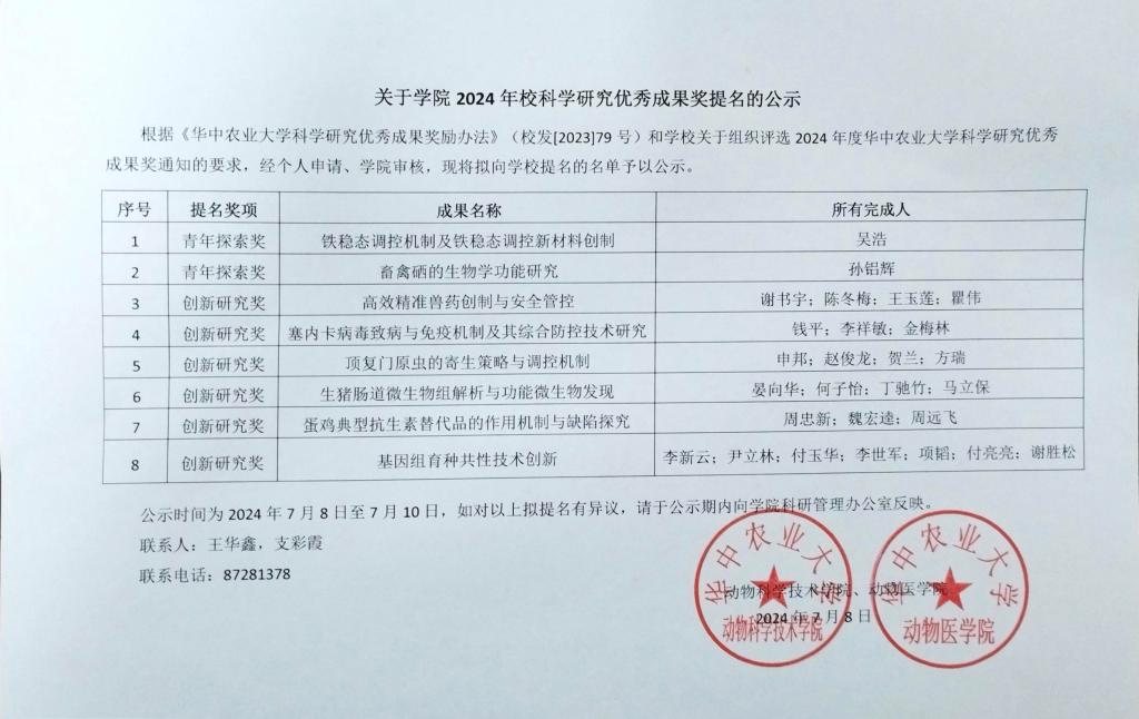 关于公司2024年校科学研究优秀成果奖提名的公示