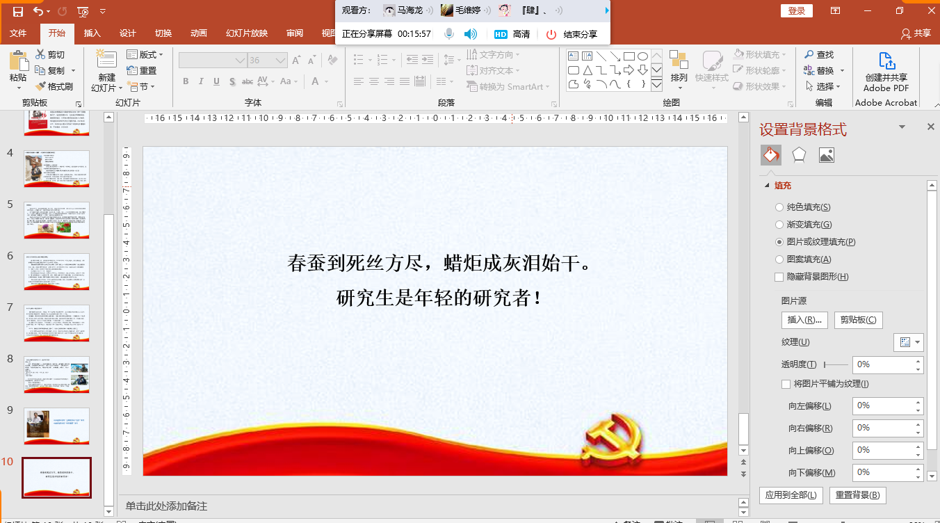 孙巨同志首先与大家进行了分享。《新时代知识分子典型——钟扬》讲述了钟扬教授鞠躬尽瘁于党的事业、国家的建设、植物科学界的发展的伟大一生。毛维婷同志从颜值、才华、性格、人品和对党、国家忠心等方面给大家讲述了周恩来总理的辉煌一生。于学祥同志向大家分享了《雷锋日记》,讲述了雷锋同志值得学习的“螺丝钉精神”,“钉子”精神和“傻子”精神,歌颂了雷锋同志有限生命却无限服务于人民的伟大精神!吴昊同志向大家展示了《干在实处,走在前列》这本书,并赞扬了习主席在时任浙江省委书记时以实干促发展、以实效为标准、以实绩论英雄的行事作风。曹华同志为大家介绍了人民楷模——李保国教授,从家人、员工、同事等各方面向大家展示了李教授将一生奉献给太行山,踏踏实实为民为国的付出自己的生命。姚伦同志分享阅读了《抗疫家书》,他讲述了在此次抗疫战斗中作出巨大贡献的英雄的故事,解读了他们勇敢、无私的拼搏精神。