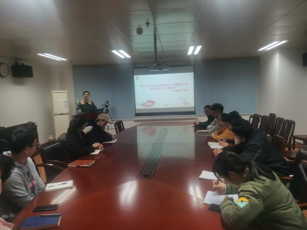 会议伊始,白嵘同志说到,新学期新气象,在繁忙的研究生学习中,希望开展的党日活动在提高我们党性的同时也能够为我们枯燥的生活带些乐趣。2020年我们实“鼠”不易,但2021年,我们得以“牛”转乾坤,圆满实现第一个百年计划——脱贫攻坚,这次党日活动主题主要是学习“习近平在脱贫攻坚表彰大会上的讲话”。学习内容主要以视频的形式呈现,视频选自新闻联播。全体党员认真聆听习主席的发言,并及时做笔记记录自己的感想,观看脱贫攻坚表彰大会。听了习近平总书记的重要讲话后,大家踊跃发表感言,汤金华同志讲到作为一名中共党员,我们一定要不忘初心,牢记使命,坚持中国共产党的领导,全心全意服务群众。事实证明中国共产党具有无比坚强的领导力、组织力、执行力,是团结带领人民攻坚克难、开拓前进最可靠的领导力量。只要我们始终不渝坚持党的领导,就一定能够战胜前进道路上的任何艰难险阻,不断满足人民对美好生活的向往!接着李双双同志发表感想:纵览古今、环顾全球,能在这么短的时间内实现7.7亿人的脱贫,这个成绩属于中国,也属于世界!伟大事业蕴含伟大精神,伟大精神引领伟大事业,中国人民最朴实的精神就是脚踏实地,吃苦耐劳的精神,社会主义是干出来的,新时代是奋斗出来的,所以我们能做的就是接下来要更加勤奋忘我的做科研,为祖国的科研事业贡献力量。