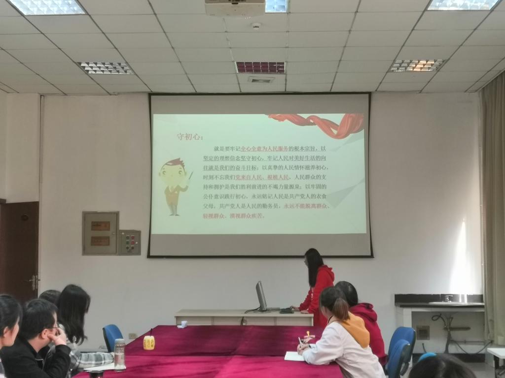 会议伊始,郭金丽带领大家重温了中国共产党人的初心和使命,就是为中国人民谋幸福,为中华民族谋复兴。守初心,就是要牢记全心全意为人民服务的根本宗旨,以坚定的理想信念坚守初心;担使命,就是要牢记我们党肩负的实现中华民族伟大复兴的历史使命,勇于担当责任,积极主动作为。并指出,身为研究生党员的我们,更应该坚定理想信念,不忘初心,牢记终身使命,砥砺前行,发挥党员的先锋模范带头作用,有理想,有担当,为实现中华民族伟大复兴贡献自己的力量。