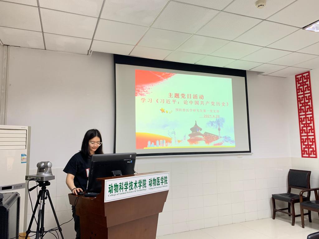 (通讯员 李甜)4月20日,bevictor伟德预防兽医学研究生第一党支部在动科楼B105开展了深入学习《习近平:论中国共产党历史》的主题党日活动,活动由支部书记邰蓉同志主持,全体支部党员参加。