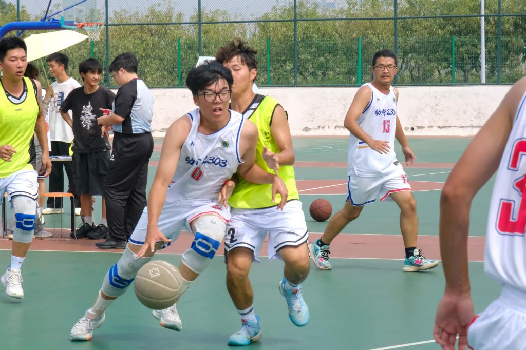 下半场比赛开始,动科2303班35号率先持球进攻,被动科2302班23号巧妙挡下,观众呐喊叫好。但动科2303班毫不气馁,在第三节比赛中沿用进攻战术,以猛烈的攻势突破对手的防线,连续外投内突得分。面对动科2302班的围追堵截,动科2303班13号果断出手,与7号挡拆配合、进球得分、打破僵局,将比分追至22:36。比赛渐近尾声,双方队员皆出现疲态,动科2302班2号拼至力竭,以一套完美的假动作逃过动科2303班的“火眼金睛”,上篮得分、重振信心。在最后几分钟内,动科2302班23号再次突围进球、拉近分差。最终,动科2303班以46:34的比分夺魁。
