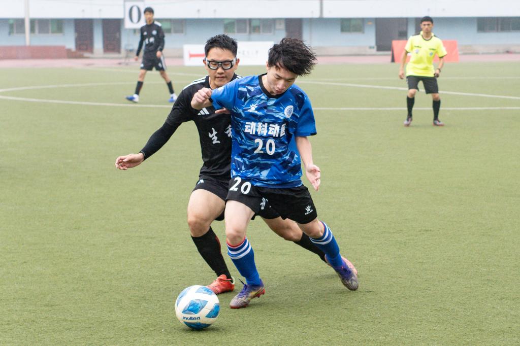 随着裁判一声哨响,比赛正式开始。生科队发起猛烈攻势,动科动医队反应敏捷,迅速形成严密的防守阵型。开场28分钟,70号谭林奇与19号胡宇潇巧妙配合传球,突出重围、单刀破门,无奈与球门擦边而过。足球场上战况激烈,双方队员的每一次拼抢都竭尽全力、互不相让,最终上半场比赛以0:0的比分结束。