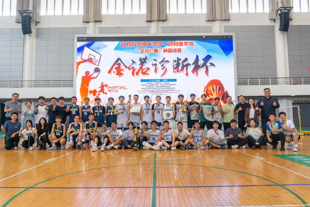 颁奖环节,北京金诺百泰公司代表、公司党委副书记、公司团委书记出席并为获奖队伍颁发奖项。公司党委副书记杨冬凯老师、北京金诺诊断市场总监金卉女士为冠军队伍——“毕业生联队”颁奖,北京金诺诊断销售总监方磊先生为亚军队伍——“王修远方传来风笛队”颁奖,公司团委书记谭力铭老师为季军队伍——“陶喆的队”颁奖。颁奖仪式结束后,全体参赛球员合影留念,至此,本届“牧医杯”篮球赛圆满落下帷幕。