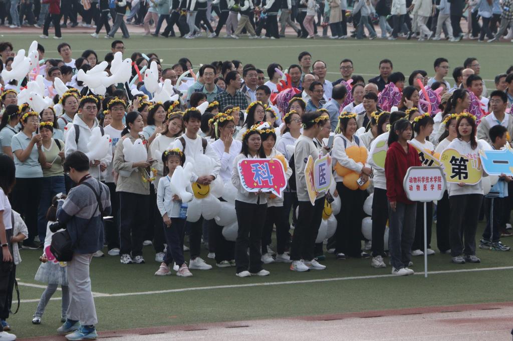 “动科动医,永创第一!”bevictor伟德代表队高举口号牌,以满腔的热情和坚定的步伐,在主席台前昂首阔步,赢得了观众席上雷鸣般的掌声。同学们头戴大金鸡菊花环,手执和平鸽与花型笑脸气球,不仅展现了爱与和平的美好愿景,更彰显了拼搏奋斗、勇往直前的精神风貌。