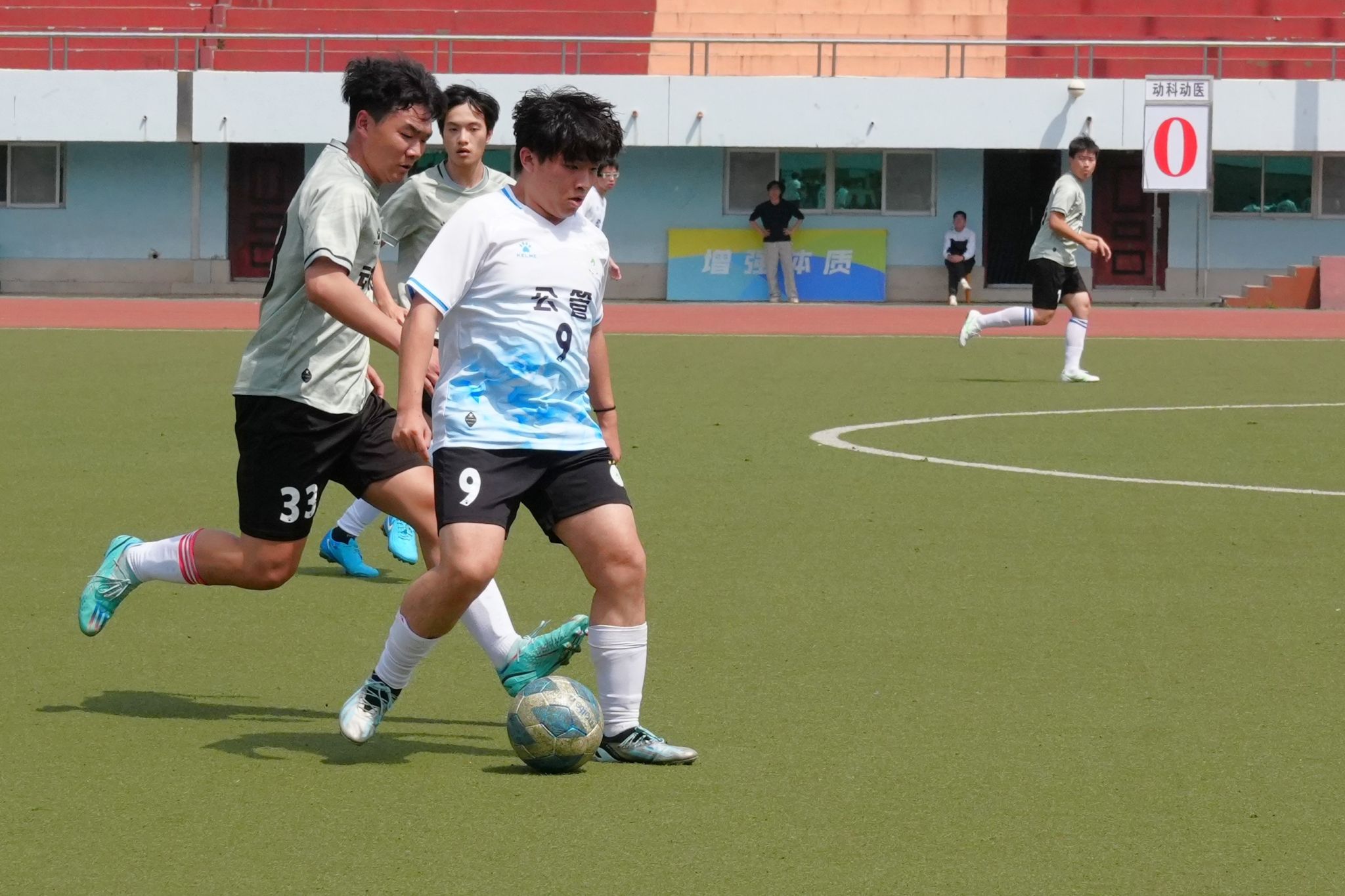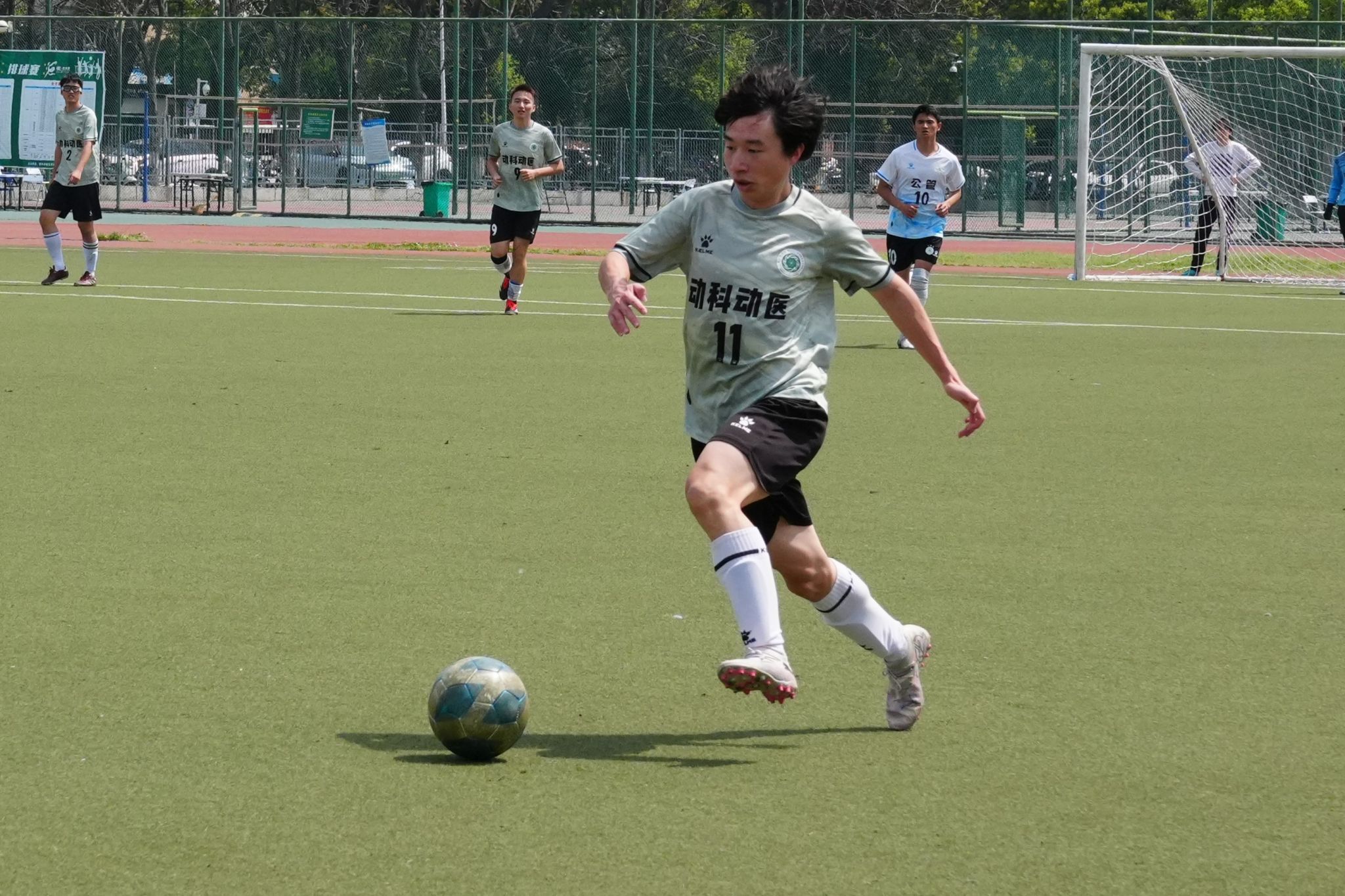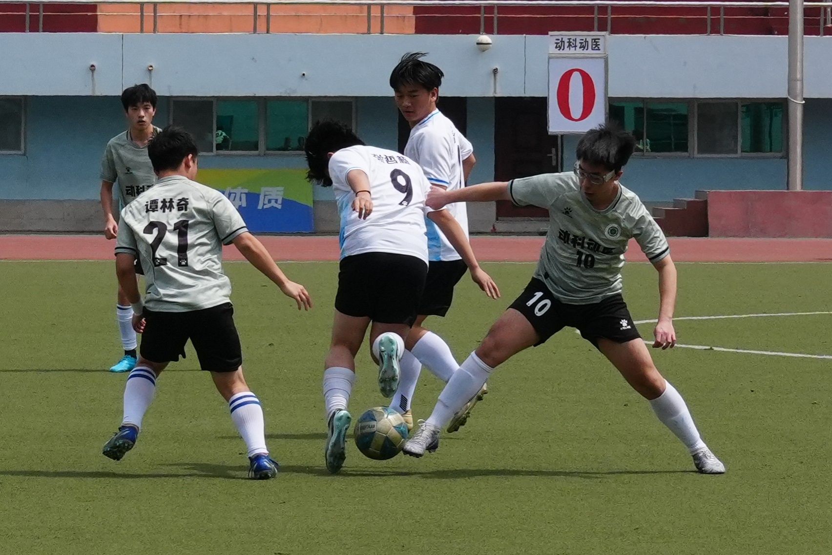 上半场比赛中,动科动医队21号谭林奇率先抢得球权。在公管队球员的左右合围之下,他凭借出色的控球能力与传球技巧,成功将球传递给动科动医队11号方煜博。方煜博得球后,果断起脚劲射,然而公管公司门将反应迅速,一跃而起,成功防守,bevictor伟德球队憾失一次得分良机。在公管公司队10号艾合麦提接球准备射门的紧要关头,21号谭林奇快速上前进行防守。双方展开激烈对抗,僵持近十秒。21号谭林奇趁其不备,将球踢向其他方向,成功瓦解了对方的进攻。